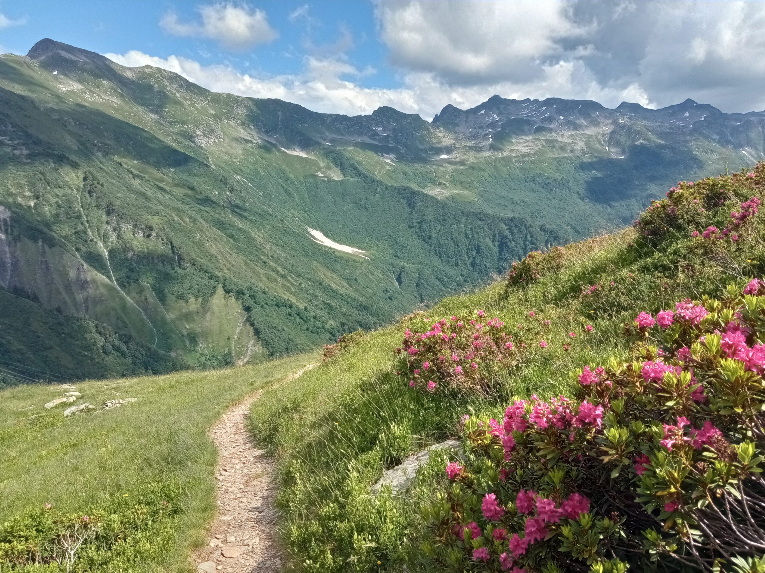 Après une mise en jambe en forêt jusqu’au lieu-dit “Fontaine au loup”, nous parcourons une piste jusqu’à rejoindre la clairière du Chenalet, qui nous offre un point de vue sur les sommets majestueux de la Lauzière. Un sentier soutenu sur une croupe nous mène jusqu’à atteindre un petit sommet à 2000m d’altitude, avec une vue imprenable sur la Combe de Savoie et le massif de Belledonne. Plus que quelques hectomètres sur le chemin de crête et nous voilà au superbe Lac Noir, lieu emblématique de Montsapey. S’ensuit une traversée vallonnée dans une combe sauvage et luxuriante jusqu’au col des Génisses.