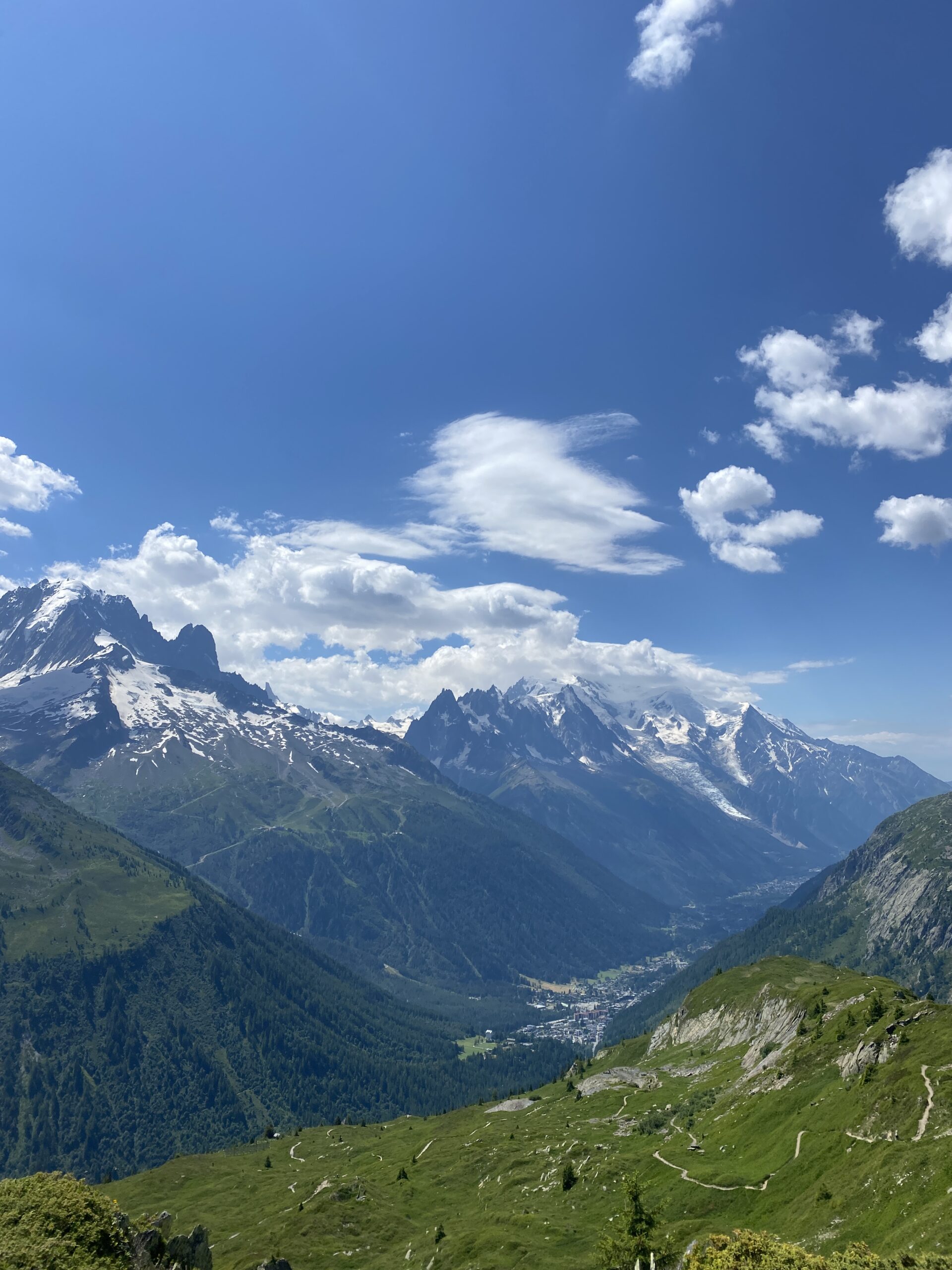 Départ de Chamonix pour les Houches en train à 9 h, puis nous prenons la télécabine de Bellevue. De là commence notre tour, on se dirige vers le col du Tricot, une montée régulière d’environ 300 m de dénivelé avec une vue splendide.