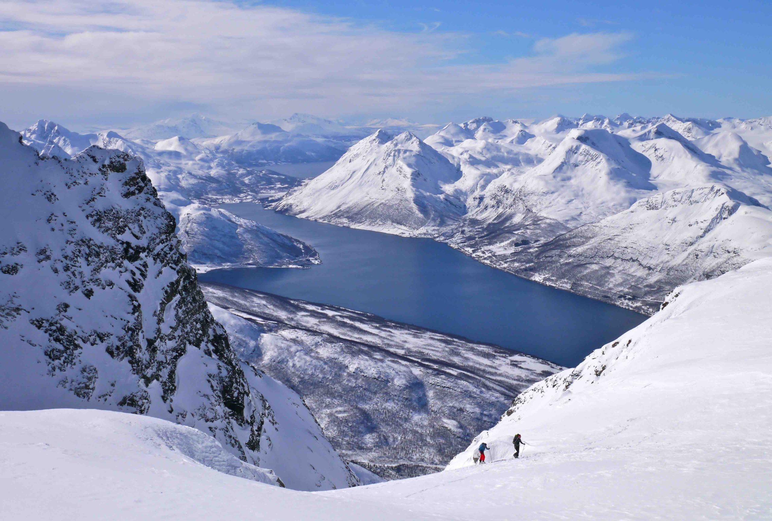 Nous sommes au cœur des fjords, le panorama est exceptionnel ! Il y a un grand choix d’itinéraires, au gré des envies et des conditions. Premier jour de ski !